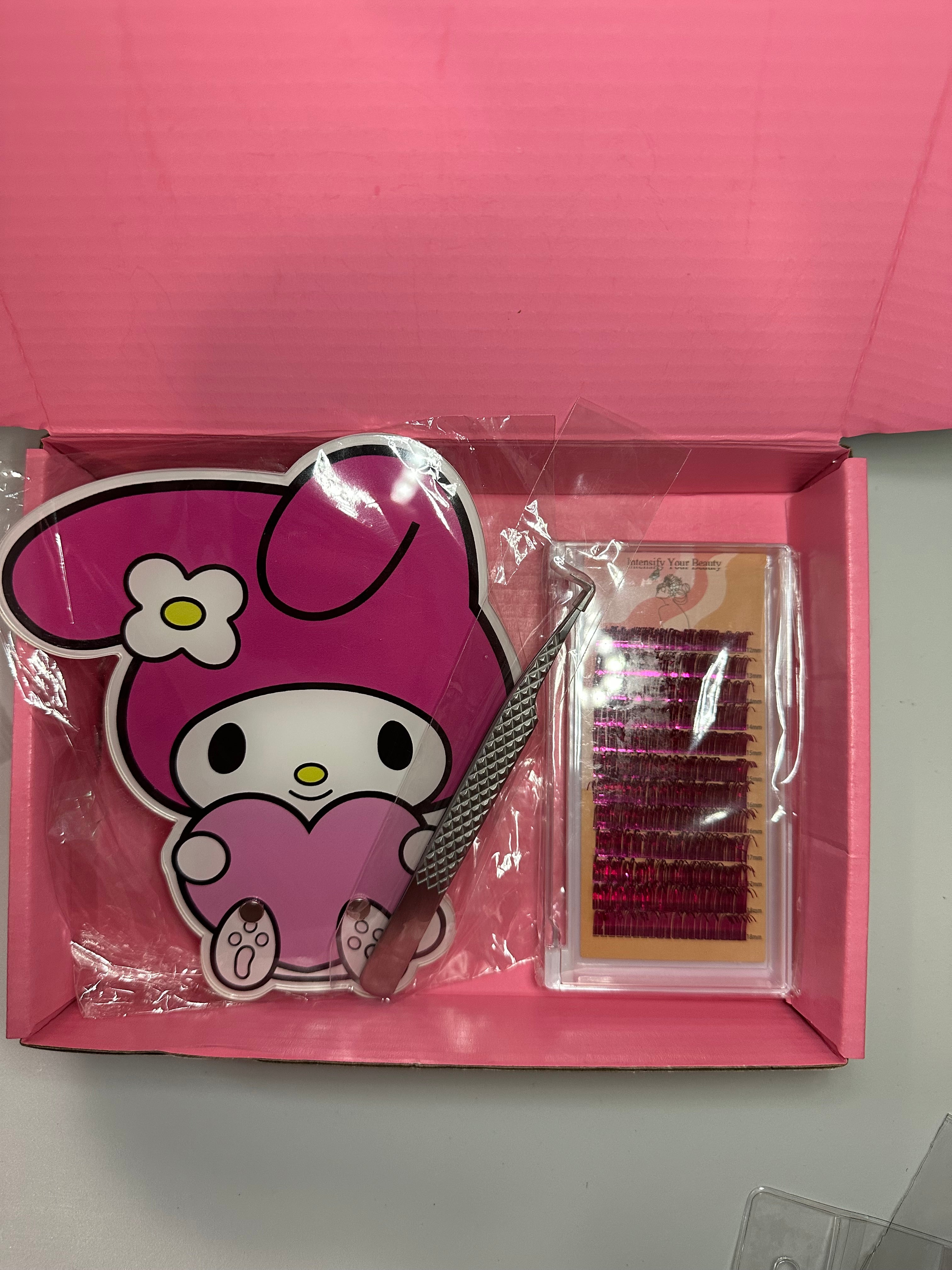 April Mini Box Features My Melody Lash Tile, Pink Metallic Lash Spikes, Silver Fiber Tip Tweezers. Add all three three to your cart and save $20 automatically. Sanrio Trio is only $30 when you add all three to your cart.